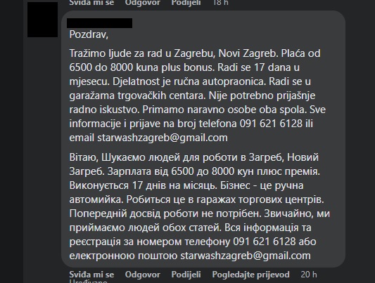 Neki su se potrudili i ponudu posla prevesti na ukrajinski jezik, neki se drže engleskog ili pak samo hrvatskog, zanimljivo je uočiti i kako neki velikodušno obećavaju sjajne uvjete (slobodni dani, plaća), detaljnije opise posla, dok drugi ipak preferiraju detalje objasniti u mailovima onima koji su zainteresirani.