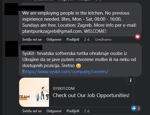 Tako se na stranici SOS Ukrajina za pridošlice iz Ukrajine nude brojni poslovi, a i sami Ukrajinci otvoreno se javljaju sa svojim kvalifikacijama i znanjima (iako brojni nisu preizbirljivi, shvaćajući da nažalost u ovoj situaciji, inzistiranje na poslu u struci nije luksuz).
