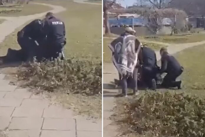 Na snimci, koju je objavio Telegram, vidi se kako starija gospođa, odjevena u pončo i sa slamnatim šeširom na glavi, pokušava pomoći svojoj kćeri koju su policajci srušili na travnjak, nastojeći joj staviti lisice na ruke.