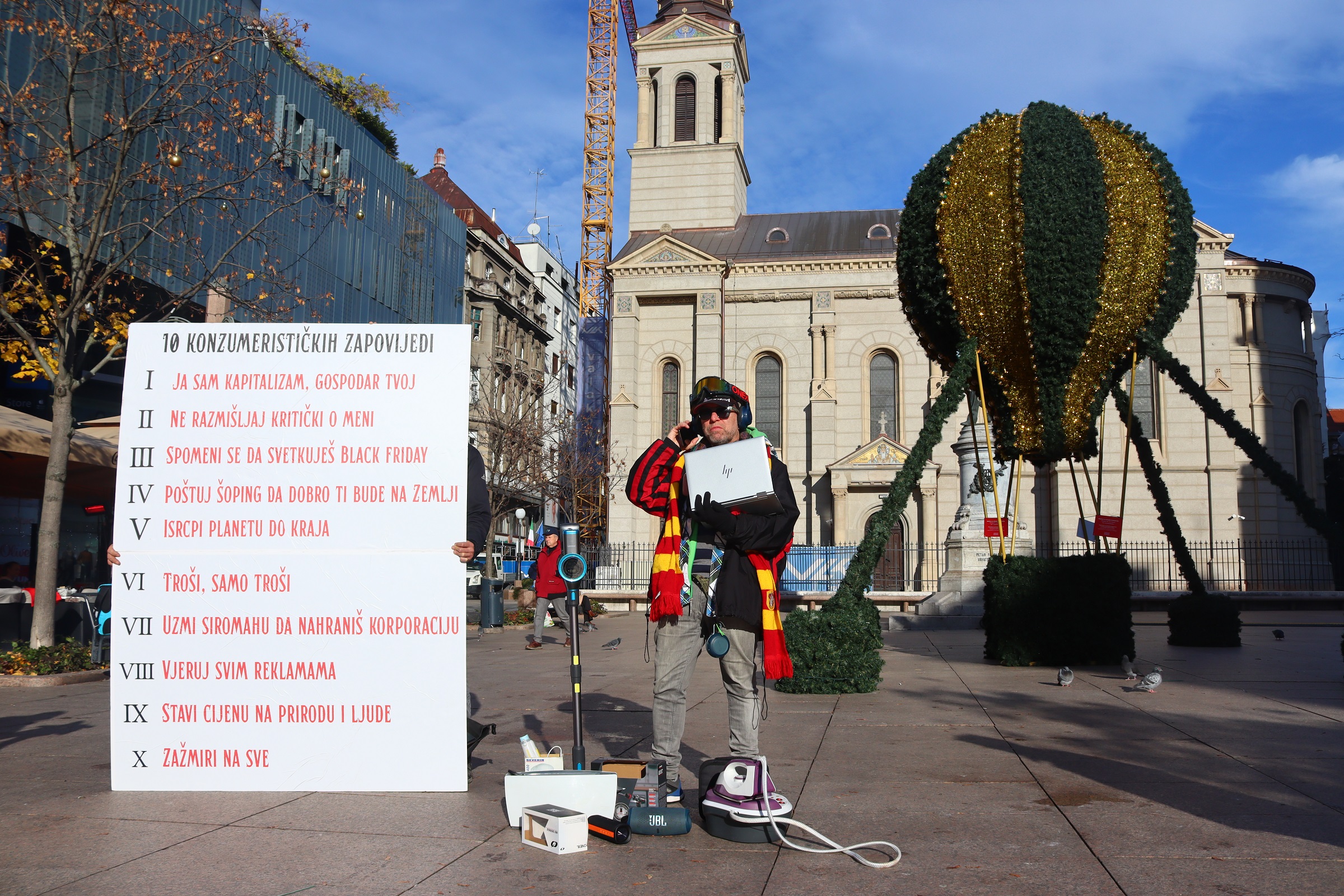 Aktivisti i aktivistkinje Zelene akcije danas su održali performans na Cvjetnom trgu u Zagrebu, gdje su na velikim su tablama prikazali deset konzmerističkih zapovijedi koje smatraju da Black Friday promiče, čime su satirično istaknuli apsurd današnjeg kapitalističkog društvenog sustava usmjerenog isključivo na rast, proizvodnju i prodaju, neovisno o cijeni koju to ima za okoliš i ljude.