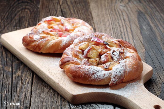 Zagrijte pećnicu na 200 °C i obložite lim papirom za pečenje. Lisnato tijesto razvaljajte i izrežite na 4 kvadrata. Pomiješajte svježi sir s medom ili javorovim sirupom. Svaki komad tijesta premažite smjesom svježeg sira. Na svježi sir složite kriške jabuke i pospite ih cimetom. Preklopite krajeve tijesta prema sredini ili ih lagano zarolajte. Premažite rubove tijesta smjesom žumanjka i mlijeka. Po želji pospite bademima u listićima. Pecite 15 – 20 minuta, dok peciva ne postanu zlatnosmeđa i hrskava. Ohladite nekoliko minuta, pospite šećerom u prahu i uživajte u toplim pecivima!