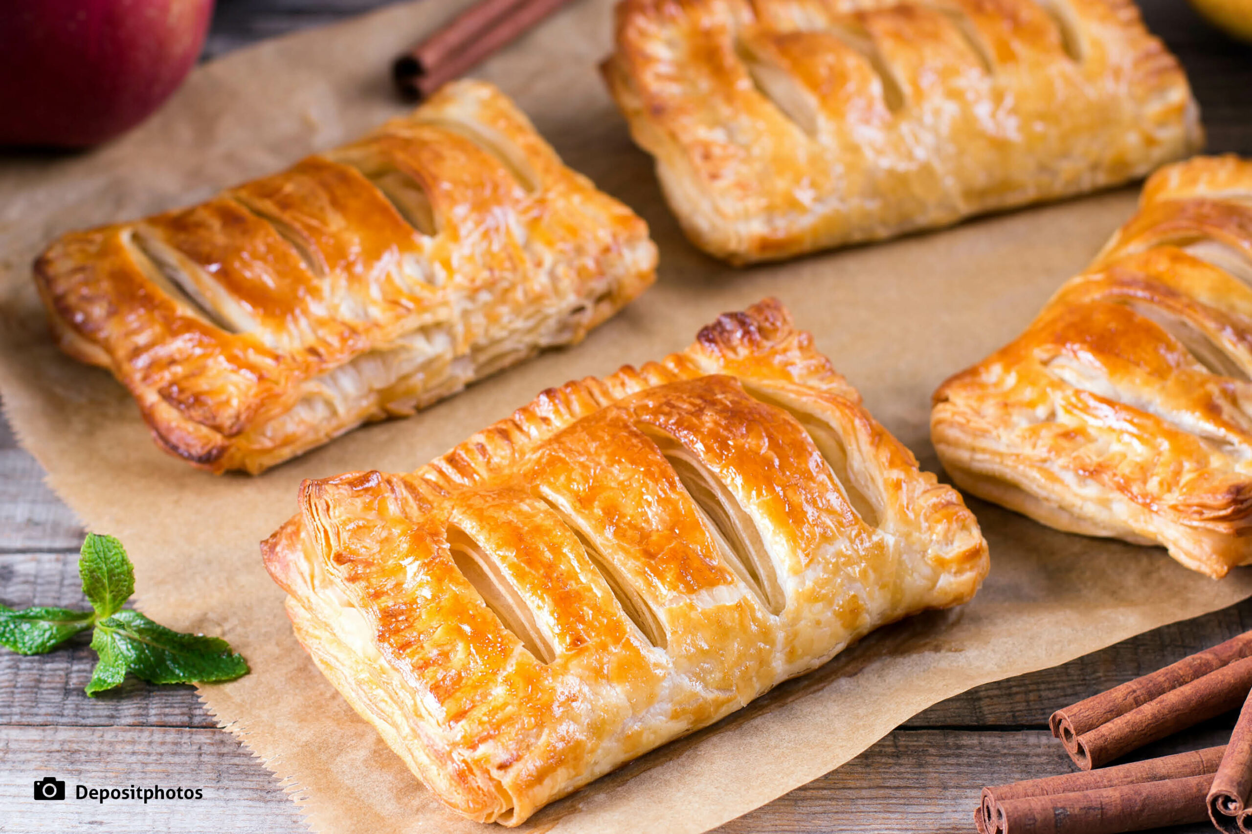 Razvaljajte lisnato tijesto i narežite ga na kvadrate (oko 10 x 10 cm). Na svaki kvadrat stavite malo smjese od jabuka i preklopite tijesto u oblik trokuta ili pravokutnika. Premažite jajetom i pecite u pećnici na 200 °C oko 15 minuta, dok ne poprime zlatnu boju. Poslužite toplo, posuto šećerom u prahu.