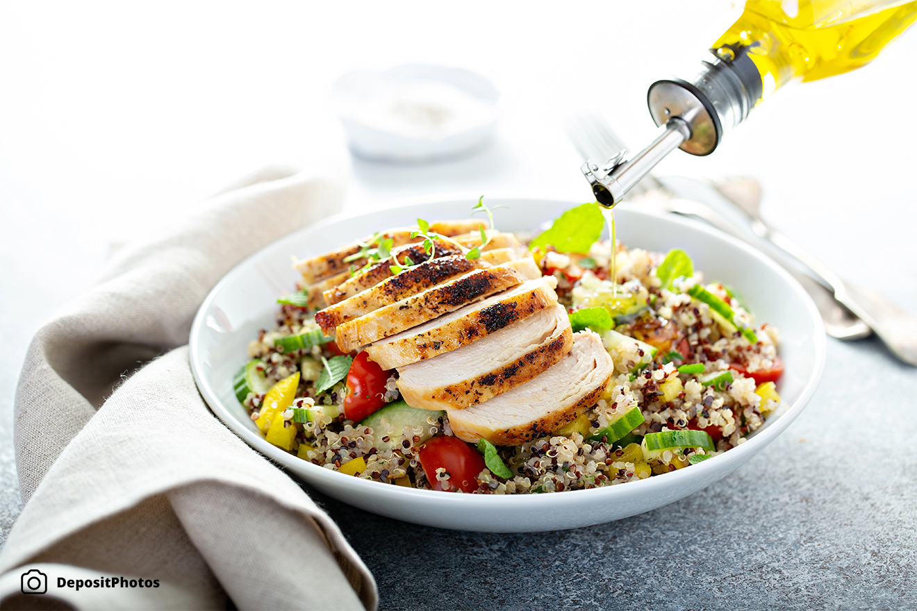Kvinoju isperite pod mlazom i skuhajte u dvostruko više vode (15 minuta). Puretinu posolite, popaprite i premažite maslinovim uljem. Ispecite je na tavi ili grillu (3 – 4 min sa svake strane). Povrće narežite na kockice i pomiješajte s kuhanom kvinojom. Poslužite puretinu s kvinojom i salatom.