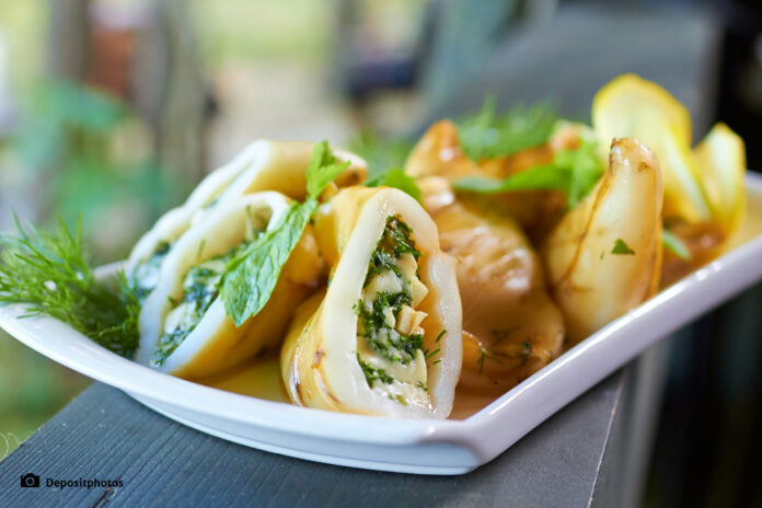 Pečene lignje poslužite uz pečeni krumpir i salatu po želji.