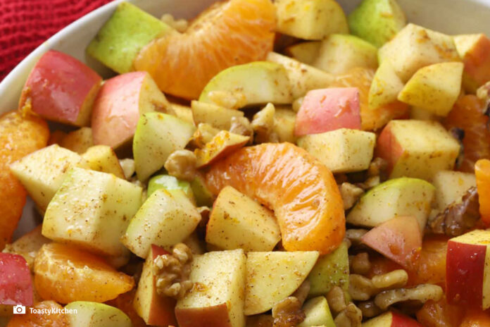 Narežite voće na kockice i prelijte ga limunovim sokom, pospite bademima i cimetom. Lagano promiješajte i poslužite. Ako želite još laganiji desert, možete izostaviti bademe i dodati malo naribane korice limuna za dodatnu aromu.