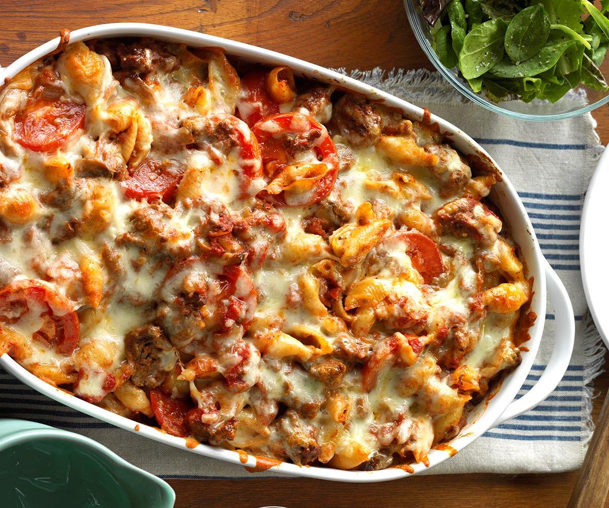 Ostavite sastojke kako ste ih promiješali. Samo gore po vrhu složite čajnu kobasicu i šunkericu. Prelijte umakom i stavite listiće goude. Zatim stavite u pećnicu na 180 stupnjeva, na 20 minuta.
