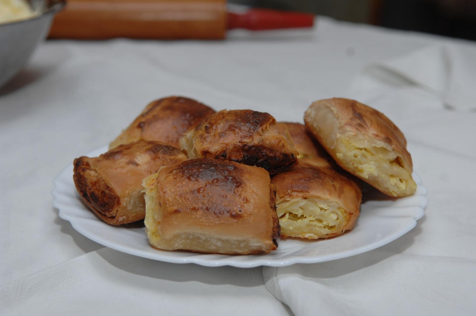 Tijesto nadijevajte i savijajte te slažite u premazani lim. Razrežite ga na komade dužine 15 cm. Pecite oko deset minuta u pećnici zagrijanoj na 180 stupnjeva. Potom štrukle izvadite i prelijte mješavinom vrhnja i žumanjaka te pecite dok ne porumene.
