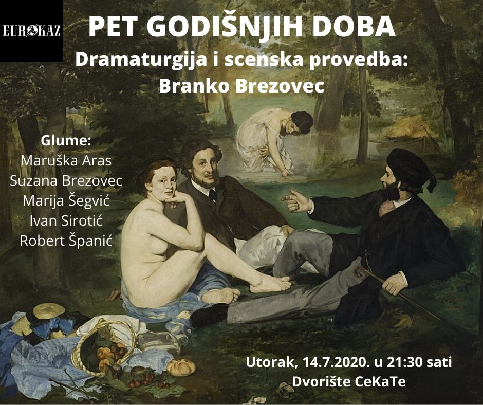 U utorak, 14. srpnja 2020. s početkom u 21,30 sati u Centru za kulturu Trešnjevka bit će izvedena predstava Pet godišnjih doba umjetničke organizacije Eurokaz.