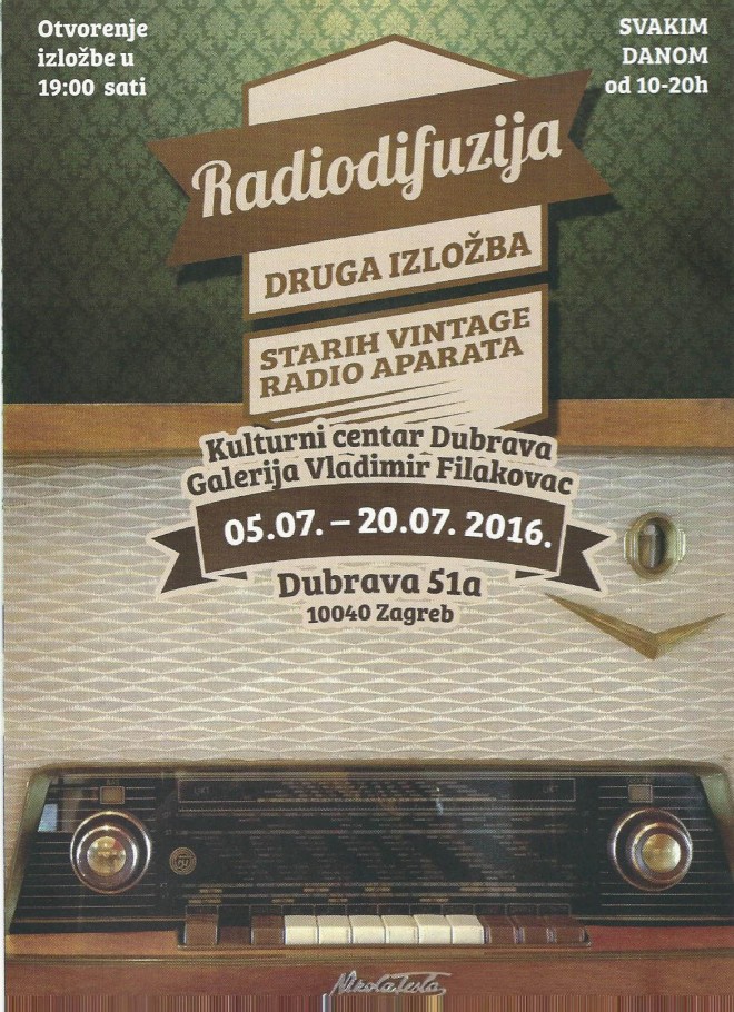 Izložba Radiodifuzija druga izložba starih vintage radio aparata otvorena je do 20.07. i može se pogledati u Kulturnom centru Dubrava, Dubrava 51 a od 10,00 – 20,00 h.