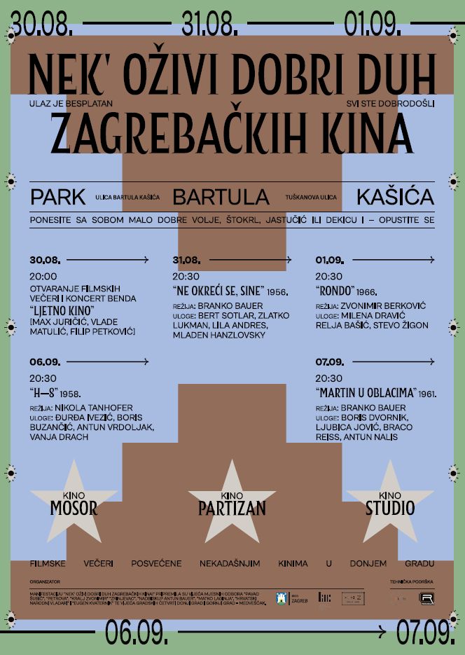 Od 30. kolovoza do 1. rujna i od 6. do 7. rujna u zagrebačkom Parku Bartula Kašića, između Ulice Bartula Kašića i Ulice Grge Tuškana održat će se filmske večeri Nek’ oživi dobri duh zagrebačkih kina!