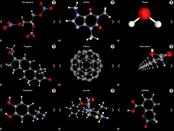 Centralni dio izložbe čine 3D projekcije 25 molekula koje su utjecale ne samo na razvoj kemije i znanosti općenito, nego također na povijest i društvo, na razvoj civilizacije.