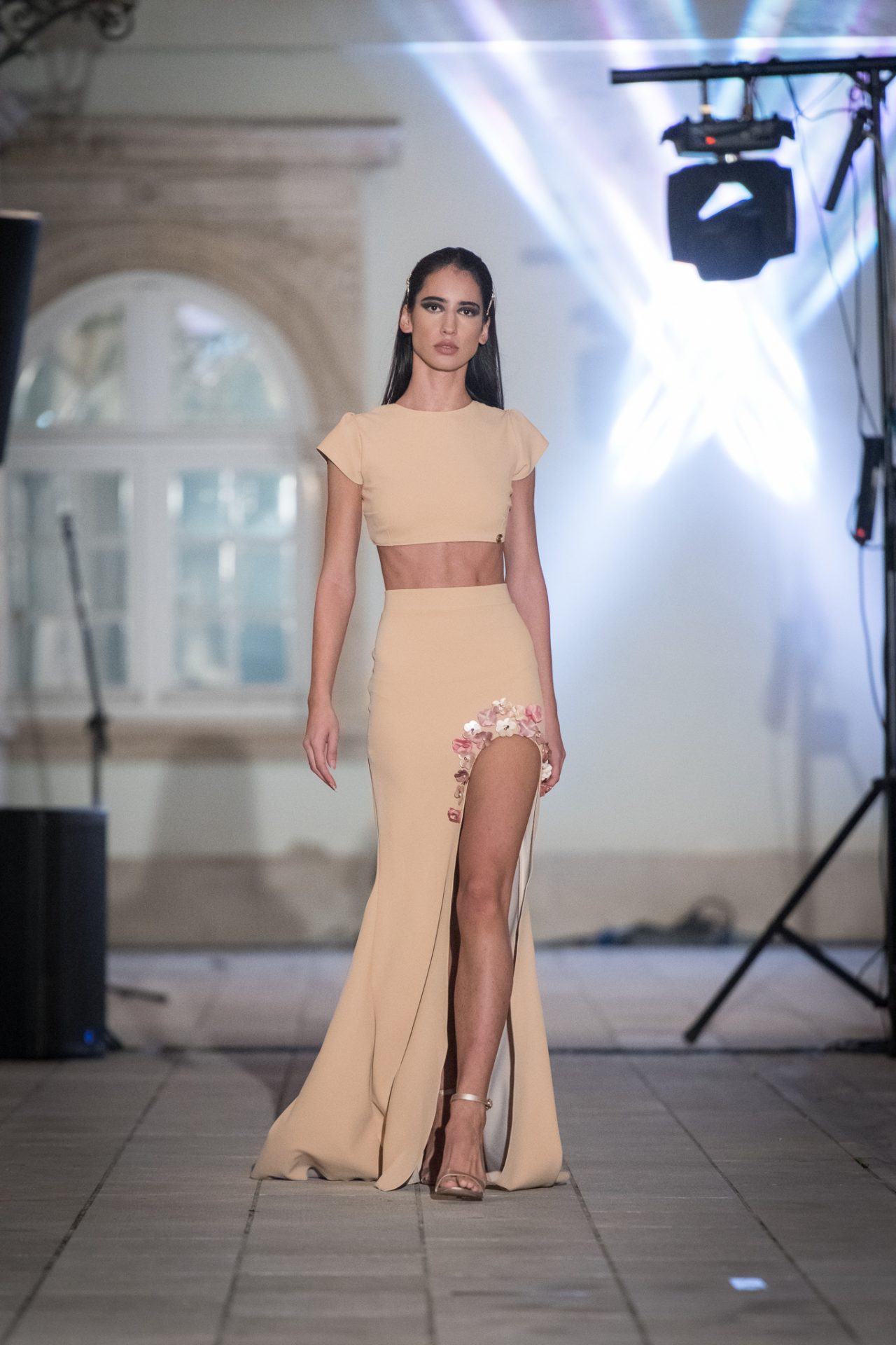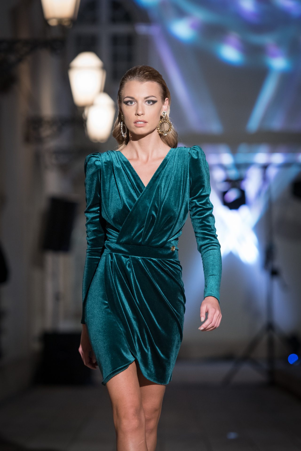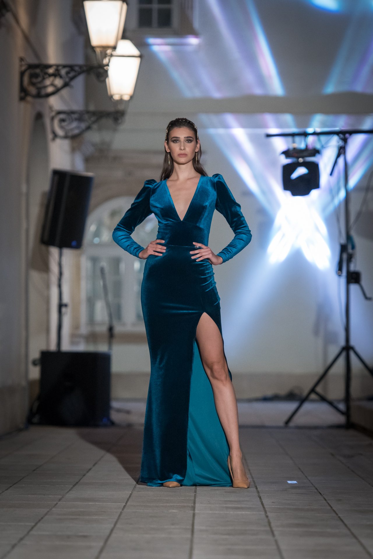 Ivana Jurić, inače inženjerka tekstilnog i modnog dizajna iz Zadra, prvi se put odlučila na samostalnu reviju. Sukladno prostoru u kojem se održava revija, Ivana je pokazala kolekciju koja je ukrala sve poglede! Dizajn koji stvara odiše glamurom, bilo da je riječ od usko pripijenih haljina koje prate liniju tijela pa sve do širokih raskošnih haljina A-kroja. Ono što ovu kolekciju čini posebnom su duboki dekoltei, visoki prorezi, fokus stavlja na snažno naglašena ramena te haljine golih leđa, nabore koji dodatno naglašavaju ženske obline, gdje i one najjednostavnije haljine izgledaju raskošno! Od materijala koristi baršun, čipku, til, saten te sjajne perlice u tonovima od narančaste, crvene, bordo, ljubičaste, smaragdno zelene pa sve do tonova crne. Ivana je dizajnirala čak 45 haljina za svoju prvu samostalnu reviju.