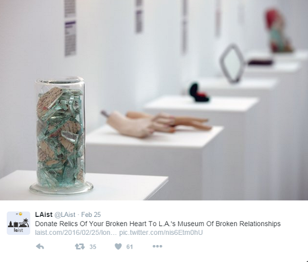 “Dobit ćemo svoj vlastiti Muzej prekinutih veza u svibnju i to na adresi 6751 Hollywood Blvd., nedaleko Hollywooda i Highlanda. Sadržavat će oko 70 izložaka iz hrvatskog muzeja i još oko 30 izložaka koje su donirali građani Los Angelesa. Ako želite donirati nešto što vas podsjeća na vaše slomljeno srce, samo naprijed. Moglo bi to biti katarzično!”, piše Index.hr pozivajući se na L.A. Weekly.