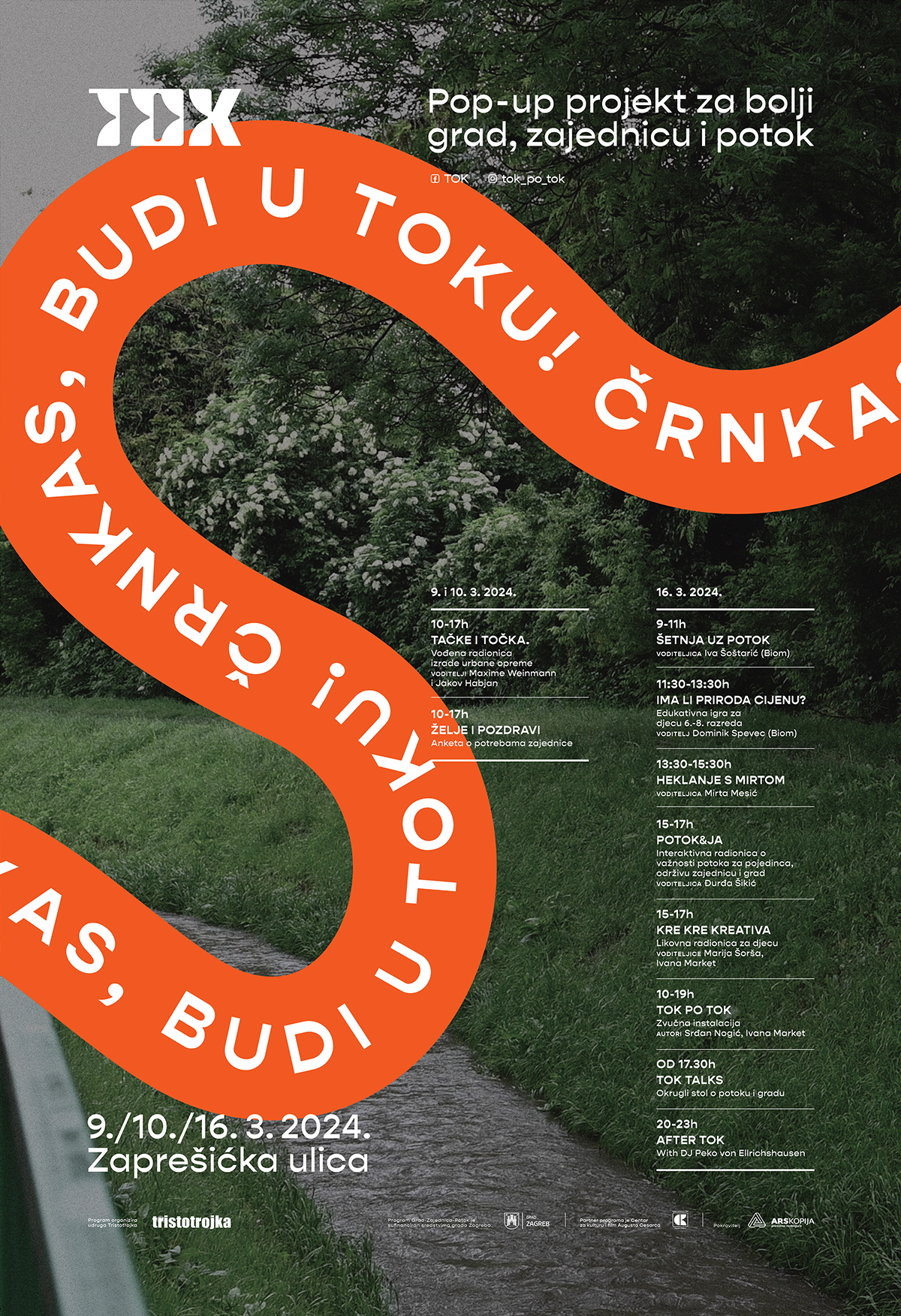 TOK je novi program udruge Tristotrojka nastao u partnerstvu s Centrom za kulturu i film Augusta Cesarca koji će kroz održati kroz dva vikenda, 9.-10.3. i 16.3., te oživjeti prostor i zajednicu uz potok Črnomerec u Zaprešićkoj ulici.