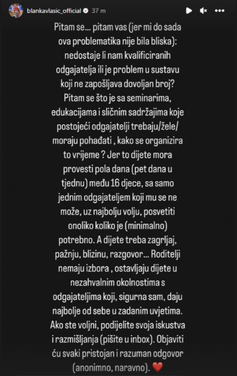Poziva Blanka putem svog Instagram profila i sve roditelje s iskustvima oko ove teme da joj se jave u inbox, pa eto prilike da se, možda, angažmanom javne osobe poput Blanke nešto i pomakne prema naprijed.