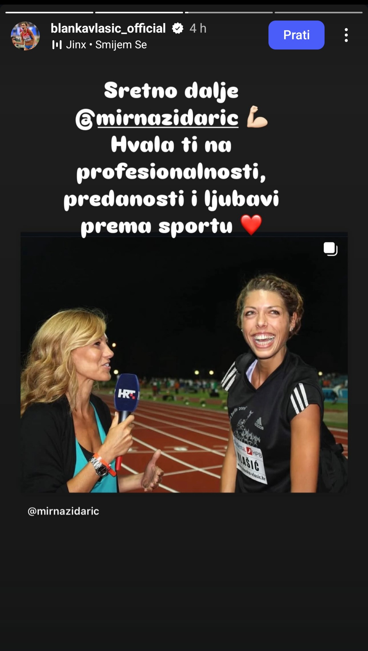 “Sretno dalje Mirna! Hvala ti na profesionalnosti, predanosti i ljubavi prema sportu”, napisala je Blanka uz fotografiju iz mlađih dana na kojoj nasmijano pozira dajući intervju upravo spomenutoj sportskoj novinarki.
