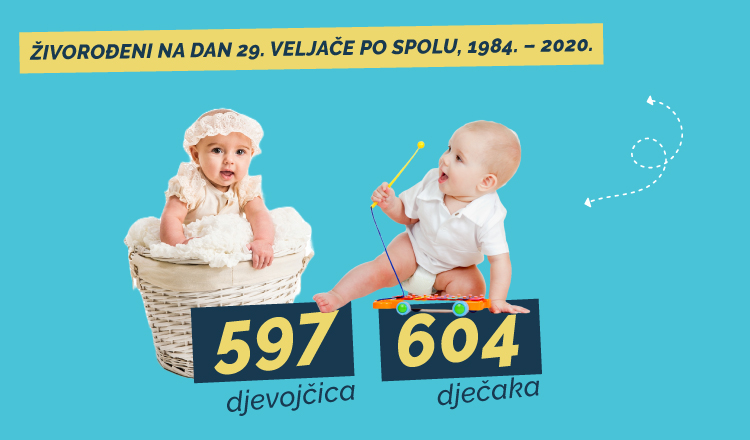 A u potrazi za rođenima na ovaj datum prošetali smo kroz podatke čak unatrag četrdeset godina, odnosno sve do 1984., i vidjeli da je otad do danas prijestupna godina s najviše živorođenih na dan 29. veljače bila 1988., kada se rodilo njih 202, a najmanje ih je bilo 2020., kada je na taj datum živorođeno ukupno 66 beba.