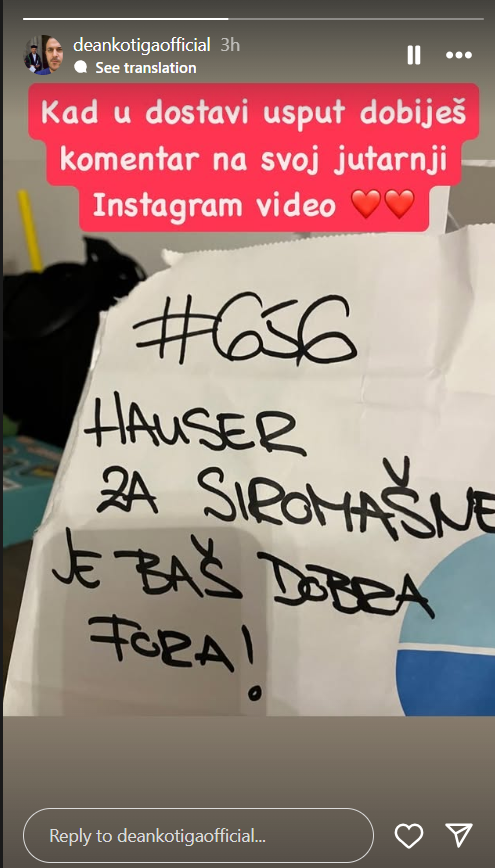 Deanov video nije ostao samo virtualni hit. Njegova popularnost prelazi granice društvenih mreža, što dokazuje i anegdota koju je podijelio sa svojim pratiteljima. Uz jednu od dostava koju je primio, našla se poruka: “Hauser za siromašne je baš dobra fora!” Ova spontanost pokazuje kako Deanov humor pronalazi put do publike u najrazličitijim situacijama. Uz fotografiju poruke, Dean je napisao: “Kad u dostavi dobiješ komentar na svoj jutarnji Instagram video”.