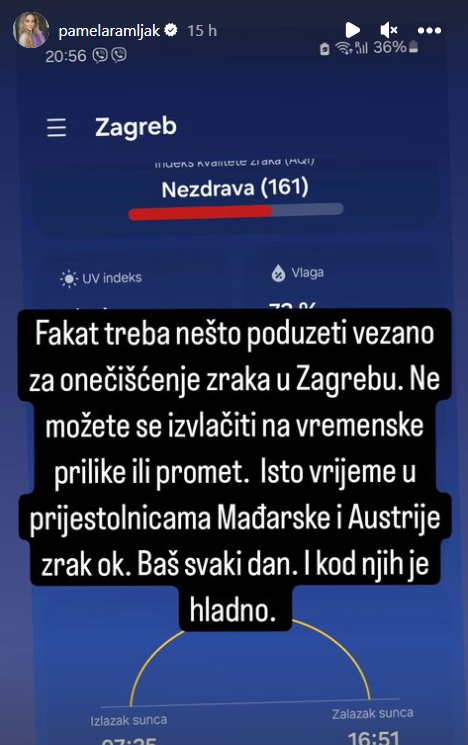 Naime, Ramljak je putem Instagrama podijelila podatak kako je indeks kvalitete zraka (AQI) u Zagrebu jučer iznosio 161.