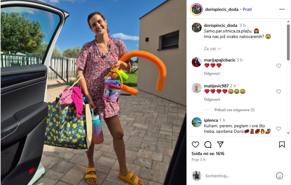 “Samo par sitnica za plažu. Ima nas još ovako natovarenih?”, upitala je Doris uz fotografiju na kojoj pozira u šarenoj ljetnoj haljini i šlapama, pritom noseći veliku ljetnu torbu s odjećom, bocu, plastične kantice i dječju dudu.