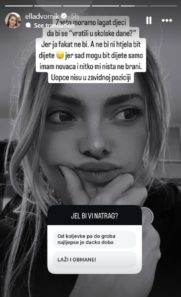 “Zašto moramo lagati djeci da bismo se vratili u školske dane? Jer ja stvarno ne bih. A ne bih ni htjela biti dijete jer sad mogu biti dijete, samo imam novca i nitko mi ništa ne brani. Uopće nisu u zavidnoj poziciji”, napisala je Ella te pitali pratitelje bi li se oni vratili kroz vrijeme.