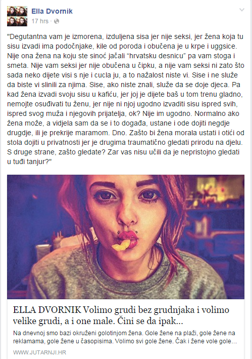 “Degutantna vam je izmorena, izduljena sisa jer nije seksi, jer žena koja tu sisu izvadi ima podočnjake, kile od poroda i obučena je u krpe i uggsice. Nije ona žena na koju ste sinoć jačali “hrvatsku desnicu” pa vam stoga i smeta. Nije vam seksi jer nije obučena u čipku, a nije vam seksi ni zato što sada neko dijete visi s nje i cucla ju, a to nažalost niste vi. Sise i ne služe da biste vi slinili za njima. Sise, ako niste znali, služe da se doje djeca. Pa kad žena izvadi svoju sisu u kafiću, jer joj je dijete baš u tom trenu gladno, nemojte osuđivati tu ženu, jer nije ni njoj ugodno izvaditi sisu ispred svih, ispred svog muža i njegovih prijatelja, ok? Nije im ugodno. Normalno ako žena može, a vidjela sam da se i to događa, ustane i ode dojiti negdje drugdje, ili je prekrije maramom. Dno. Zašto bi žena morala ustati i otići od stola dojiti u privatnosti jer je drugima traumatično gledati prirodu na djelu. S druge strane, zašto gledate? Zar vas nisu učili da je nepristojno gledati u tuđi tanjur”, samo je dio Ellina teksta na koji su obožavatelji reagirali.