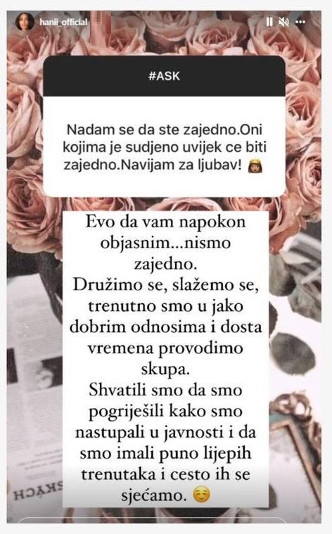 Ovog puta, Hana je otišla korak dalje, te otkrila još jedan detalj o njihovom odnosu na Instagram storyju, te odlučila stati na kraj nagađanjima jesu li se pomirili nakon susreta ili ne.