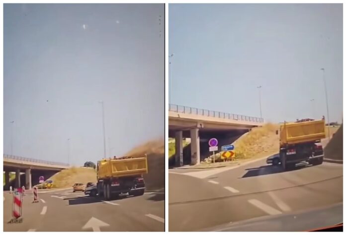 Ova neobična scena odigrala se kod kružnog toka ispred ulaza u Split. U snimci se vidi kako kamion s prikolicom vozi, a ispred njega s desne strane izađe auto, koji kamion “pokupi” i nastavi gurati ispred sebe.