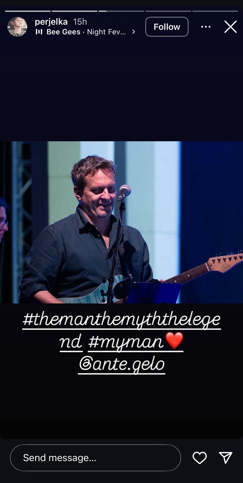 ”Čovjek, mit, legenda”, napisala je Perčin uz fotografiju Gele s gitarom na pozornici. U pozadinu je stavila i hit “Night fever” Bee Geesa, a na kraju dodala i potvrdu da je uistinu njen. “Moj čovjek”, stavila je u hešteg na engleskom i dodala crveno srce.
