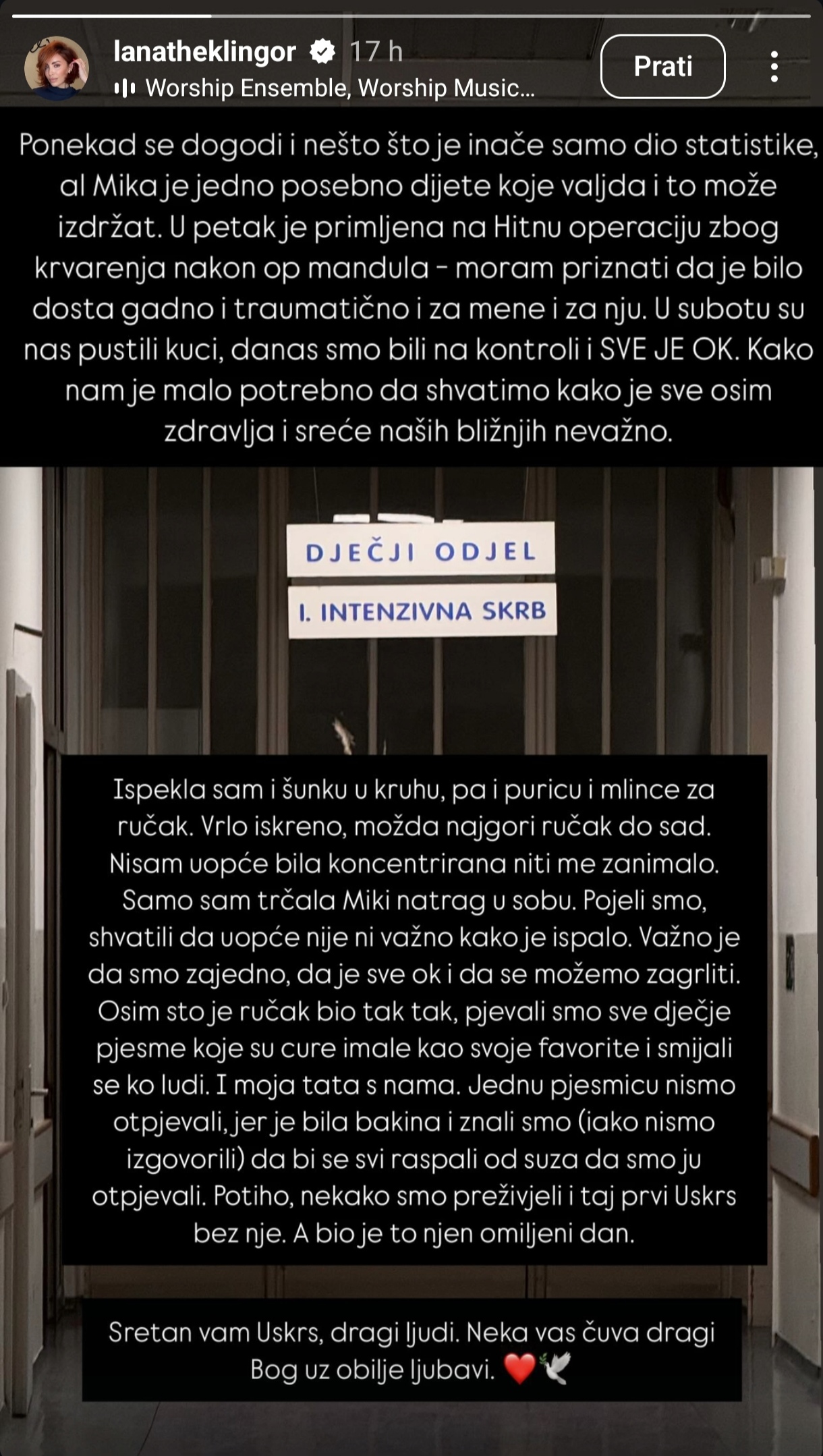“Ponekad se dogodi i nešto što je inače samo dio statistike, al’ Mika je jedno posebno dijete koje valjda i to može izdržati. U petak je primljena na hitnu operaciju zbog krvarenja nakon operacije mandula – moram priznati da je bilo dosta gadno i traumatično i za mene i za nju”, započela je Lana.