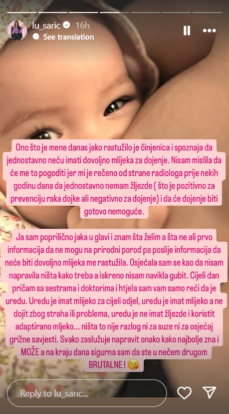 Osjećala sam se kao da nisam napravila ništa kako treba, a iskreno nisam navikla gubiti. Cijeli dan pričam sa sestrama i doktorima i htjela sam vam samo reći da je u redu. U redu je imati mlijeko za cijeli odjel, u redu je imati mlijeko, a ne dojiti zbog straha ili problema, u redu je ne imati žlijezde i koristiti adaptirano mlijeko… ništa to nije razlog ni za suze ni za osjećaj grižnje savjesti. Svatko zaslužuje napraviti onako kako najbolje zna i može, a na kraju dana sigurna sam da ste u nečem drugom brutalne”, poručila je.