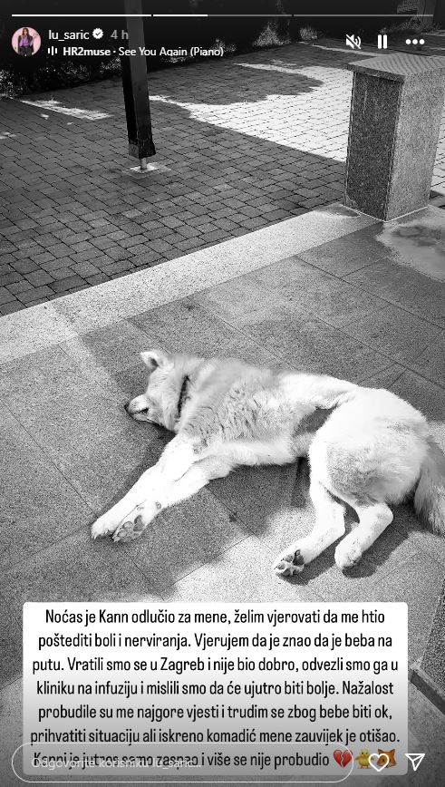 “Noćas je Kann odlučio za mene, želim vjerovati da me htio poštedjeti boli i nerviranja. Vjerujem da je znao da je beba na putu. Vratili smo se u Zagreb i nije bio dobro, odvezli smo ga u kliniku na infuziju i mislili smo da će ujutro biti bolje. Nažalost, probudile su me najgore vijesti i trudim se zbog bebe biti ok, prihvatiti situaciju, ali iskreno komadić mene zauvijek je otišao. Kann je jutros samo zaspao i više se nije probudio”, poručila je Lucia putem druge objave.