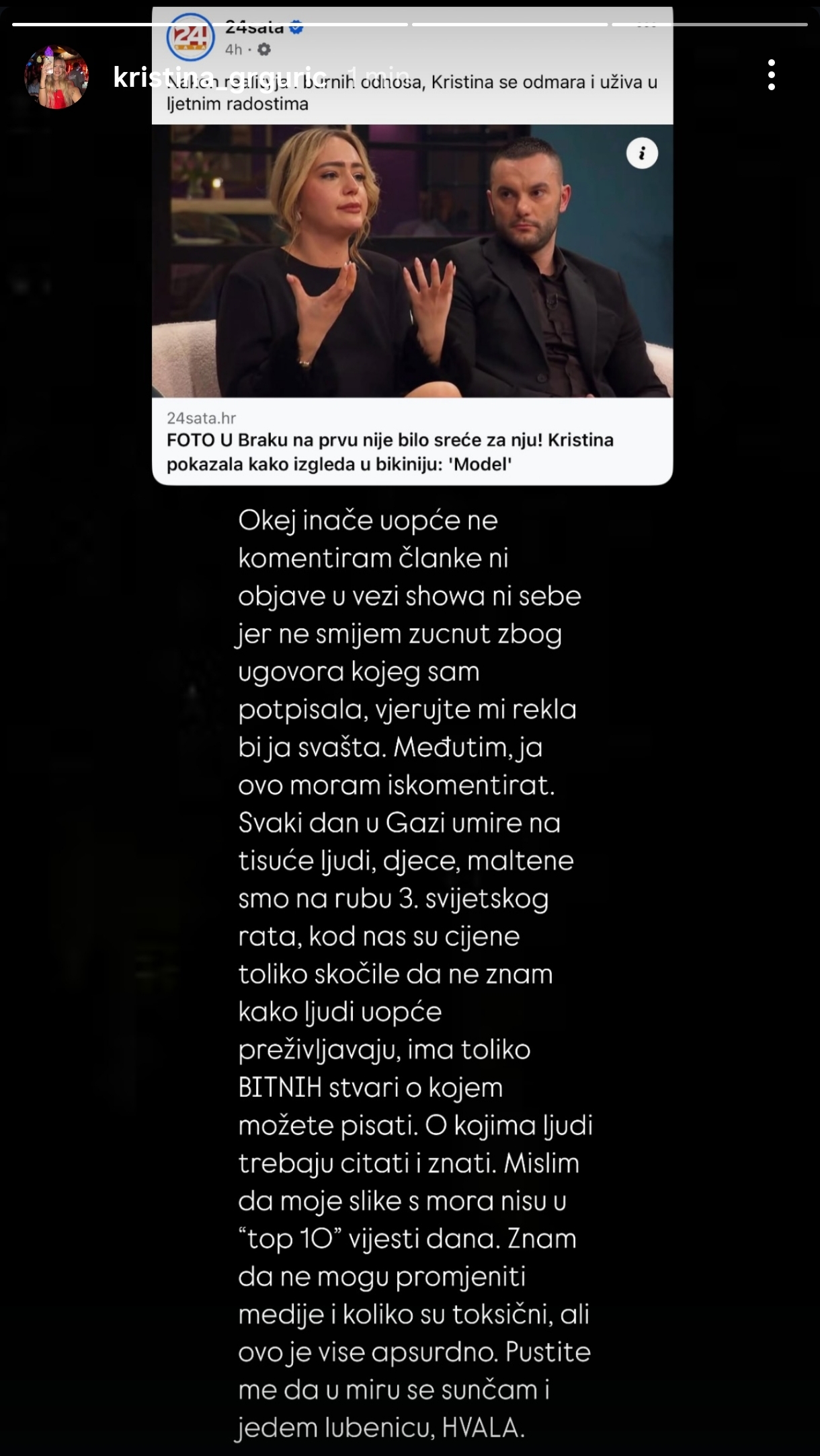 Mislim da moje slike s mora nisu u ‘top 10’ vijesti dana. Znam da ne mogu promijeniti medije i koliko su toksični, ali ovo je više apsurdno. Pustite me da se u miru sunčam i jedem lubenicu, hvala”, poručila je Kristina putem Instagram storyja.