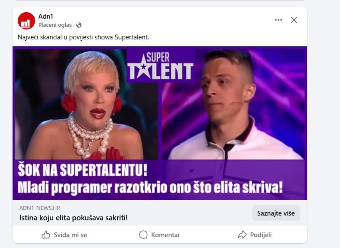 Društvenim mrežama kruži sve više lažnih vijesti, a među njima su se našla i one o popularnom showu Nove TV Supertalent. Naime, prevaranti su napravili lažno sučelje N1 televizije na kojem bombastično najavljuju “ŠOK U SUPERTALENTU! Mladi programer razotkrio ono što elita skriva”, s opisom objave najveći skandal u povijesti ove emisije.