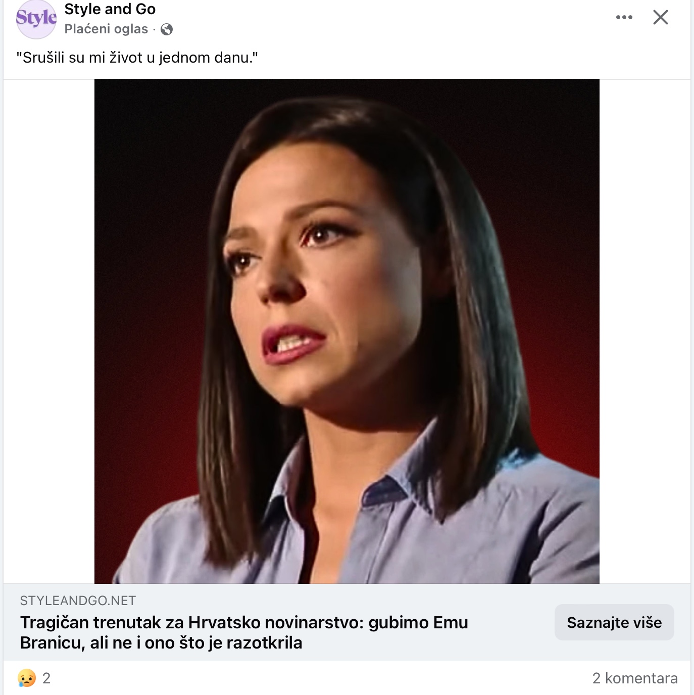 Uz dotični naslov, s očitim pravopisnim greškama, dodan je i njezin navodni citat koji kaže “Srušili su mi život u jednom danu”, a oglas je postavljen od strane Facebook stranice pod nazivom Style and Go. Očekivano, poveznica na članak vodi na lažnu stranicu koja u cilju ima prevariti korisnike Facebooka, a ovo nažalost nije prvi put da se nagrađivana novinarka Nove TV našla u ovakvom problemu.