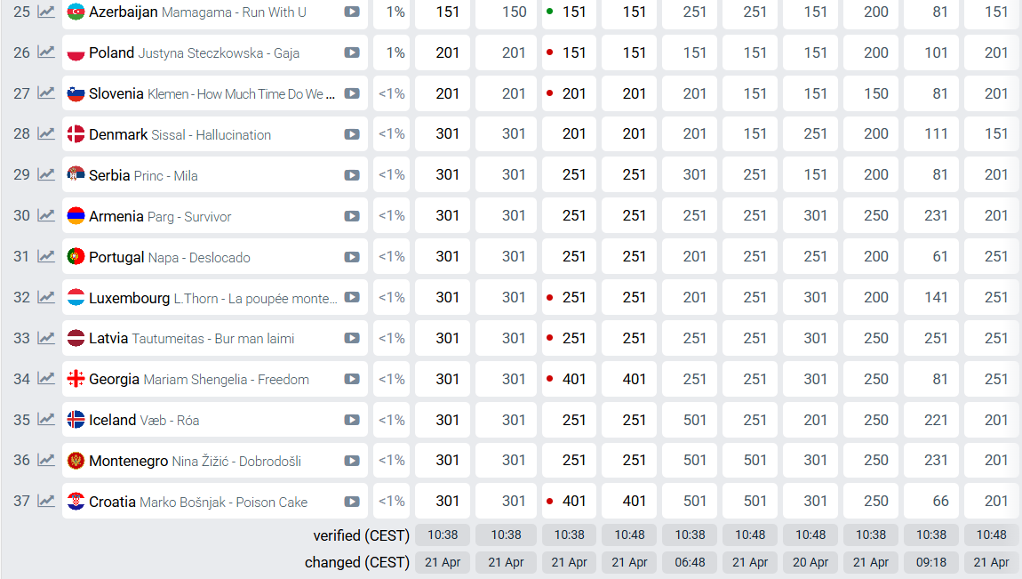 Kada je Baby Lasagna ušao kao rezerva na popis izvođača Dore, kladionice su Hrvatskoj momentalno počele jako rasti. Kada je postalo jasno da će Marko Purišić gotovo sigurno ponijeti pobjedu na Dori, šanse su nam skočile sve do samog vrha. Ove godine su jako daleko od toga, ali valja biti realan, nismo dobro stajali ni prije proglašenja pobjednika Dore.