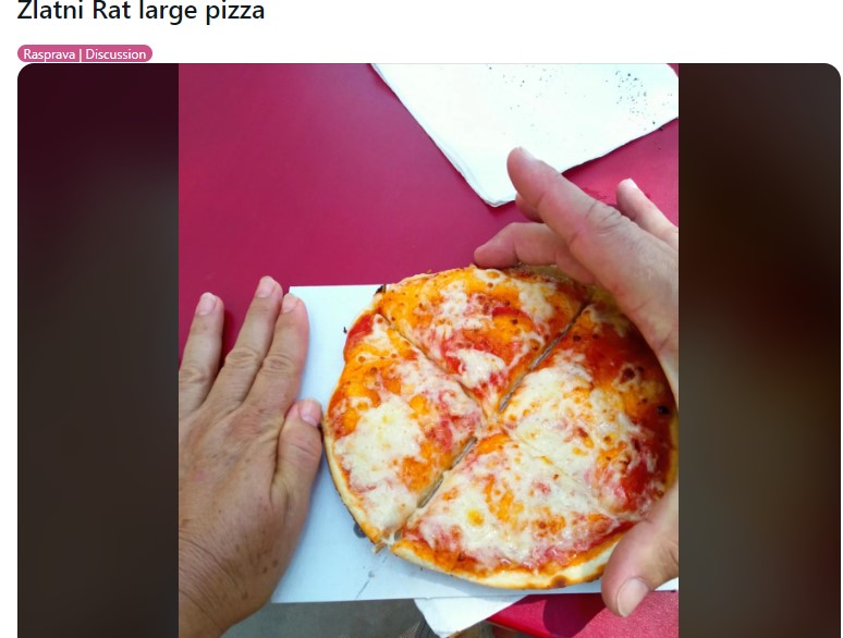 Netko je primijetio da je to već viđeno na Zlatnom ratu i objavio sliku još manje pizze, nastalu prije dvije godine. Ta je, pak, bila toliko malena i vidi se da stane u dlan odrasle osobe. Na cjeniku je reklamirana kao velika pizza.