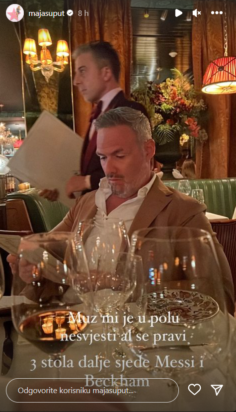 ‘Muž mi je u polunesvijesti, ali se pravi. Tri stola dalje sjede Messi i Beckham’, napisala je Maja uz snimku supruga Nenada koji poprilično ozbiljno proučava jelovnik restorana.