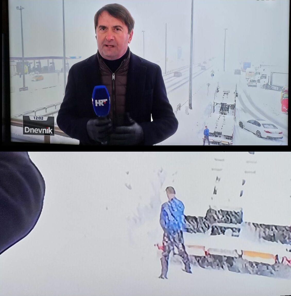 Tako se u petak u popodnevnom Dnevniku HRT-a tijekom javljanja uživo o situaciji u prometu i snijegu koji je napadao u dijelovima Hrvatske vidjela nesvakidašnja scena na koju nije mogao utjecati ni reporter niti urednici Dnevnika.