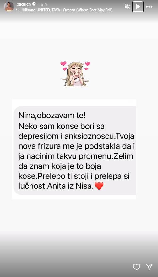 “Nina, obožavam te! Netko sam tko se bori sa depresijom i anksioznošću. Tvoja nova frizura me potakla da i ja napravim takvu promjenu. Želim znati koja je to boja kose. Prelijepo ti stoji i prelijepa si ličnost”, poručila joj je Anita iz Niša.