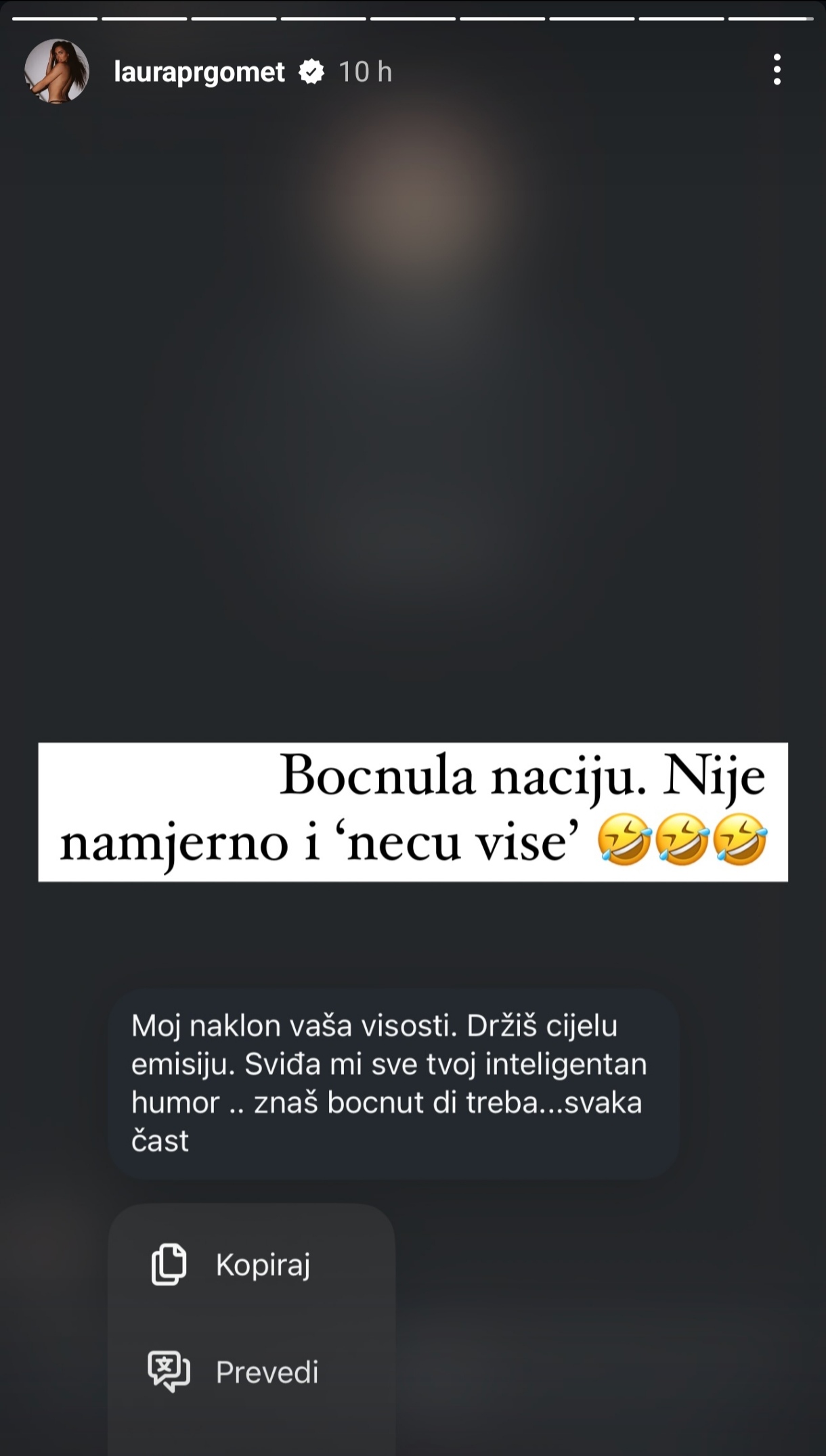 “Moj naklon vaša visosti. Držiš cijelu emisiju. Sviđa mi se tvoj inteligentan humor… znaš bocnuti gdje treba… svaka čast”, poručio je Lauri nepoznati obožavatelj na što je ona uzvratila: “Bocnula naciju. Nije namjerno i ‘neću više'”.