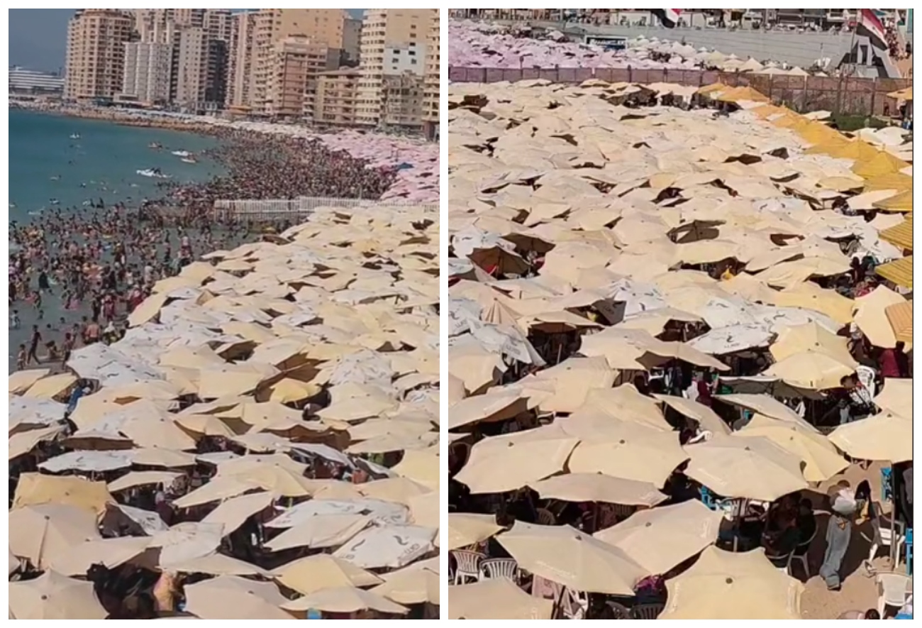 Snimka je nastala u Egiptu, a postala je viralna i prikupila više od tri milijuna pregleda. Ljudi pod suncobranima sjede u plastičnim stolcima, a samo par metara iza obruča suncobrana nalaze se stambene zgrade.