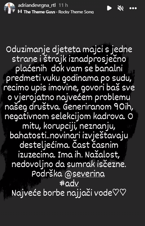 ‘Generiranom 90ih, negativnom selekcijom kadrova. O mitu, korupciji, neznanju, bahatosti… novinari izvještavaju desetljećima. Čast časnim izuzecima. Ima ih. Nažalost, nedovoljno da sumrak iščezne. Podrška Severini! Najveće borbe najjači vode’, zaključio je RTL-ovac u poruci koju je objavio putem Instagrama.