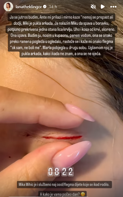 “Ja se jutros budim. Ante mi prilazi mirno i kaže: ‘Nemoj se prepast, ali dođi, Miki je pukla arkada’. Ja nalazim Miku da spava u boravku, potpuno prekrivena jedna strana lica krvlju. Uho i kosa od krvi, skoreno”, započela je Lana putem Instagram storyja.