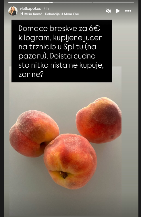 “Domaće breskve za šest eura kilogram, kupljene jučer na tržnici u Splitu (na pazaru). Dosta čudno što nitko ništa ne kupuje, zar ne?”, napisala je Vlatka uz fotografiju voća koju je objavila na svom Instagram storyju.