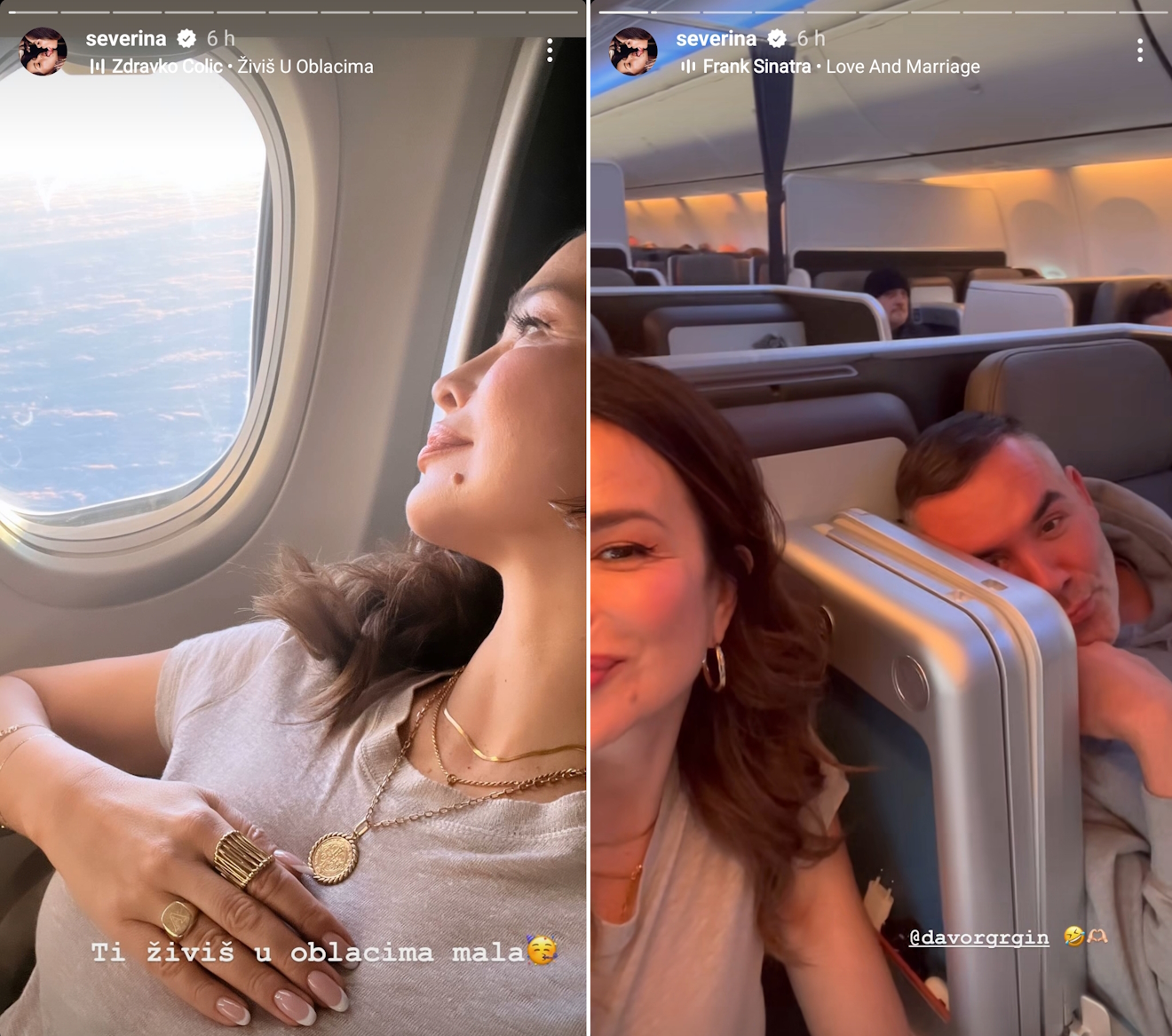 ‘Ti živiš u oblacima, mala’, napisala je uz fotografiju na kojoj čeznutljivo gleda kroz prozor aviona. Potom je otkrila da je u dragom društvu – s njom je putovao i Davor Grgin, njezin dugogodišnji prijatelj i savjetnik za odnose s javnošću.