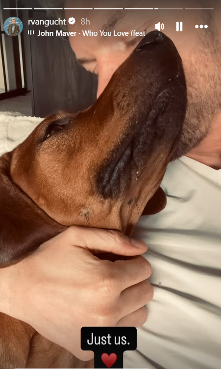U priči na Instagramu Van Gucht je pokazao svoje ljubimce, dva psa, od kojih mu je jedan bio u naručju, a drugi spavao pokraj njega na krevetu. Uz priču je dodao opis “Samo mi” te priložio pjesmu Johna Mayera “Who You Love“, a zanimljiv detalj je da je baš ta pjesma svirala na prvom plesu na vjenčanju njega i Blanke.