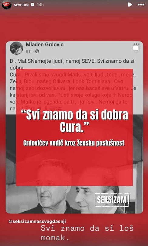 Međutim, Severina mu nije ostala “dužna”. Ubrzo mu je uputila odgovor putem Instagram Storyja: “Svi znamo da si loš momak”. Objavu je podijelila zajedno sa stranicom “Seksizam naš svagdašnji”.