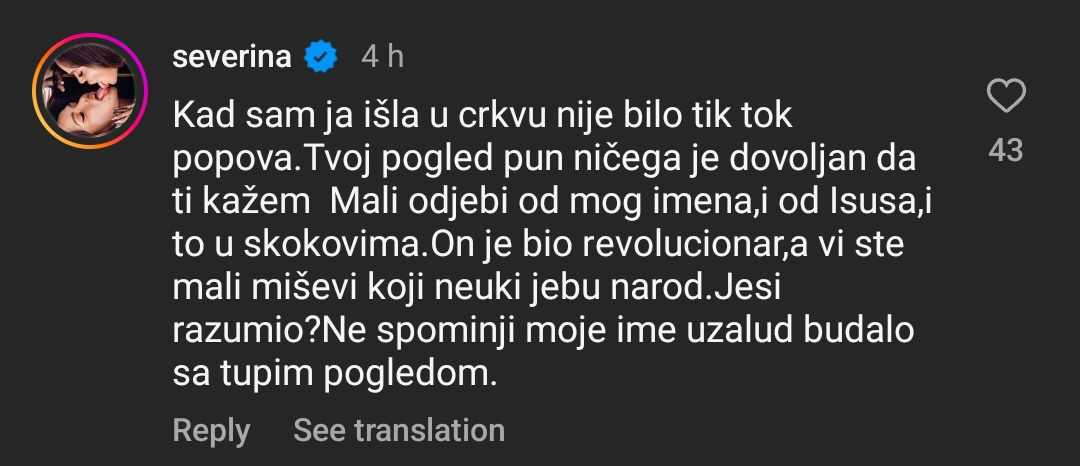 Podsjetimo, Severina je ranije ispod videa svećenika u kojoj je on proziva da laže i poziva na kavu ostavila komentar koji je glasio ‘Ustani kad kažeš Severina. Komentar je bio upućen pratitelju svećenika, koji je za Severinu rekao da ‘nije vrijedna da je svećenik uopće spominje’.