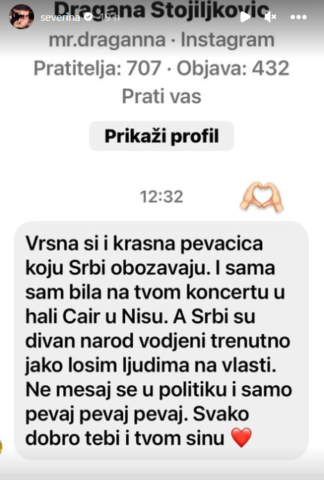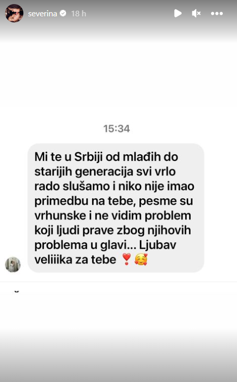 ‘Mi te u Srbiji, od starijih do mlađih generacija, svi vrlo rado slušamo i nitko nije imao primjedbu na tebe. Pjesme su vrhunske i ne vidim problem koji ljudi prave zbog njihovih problema u glavi… Ljubav velika za tebe’, poručila je tako Severini jedna od pratiteljica.